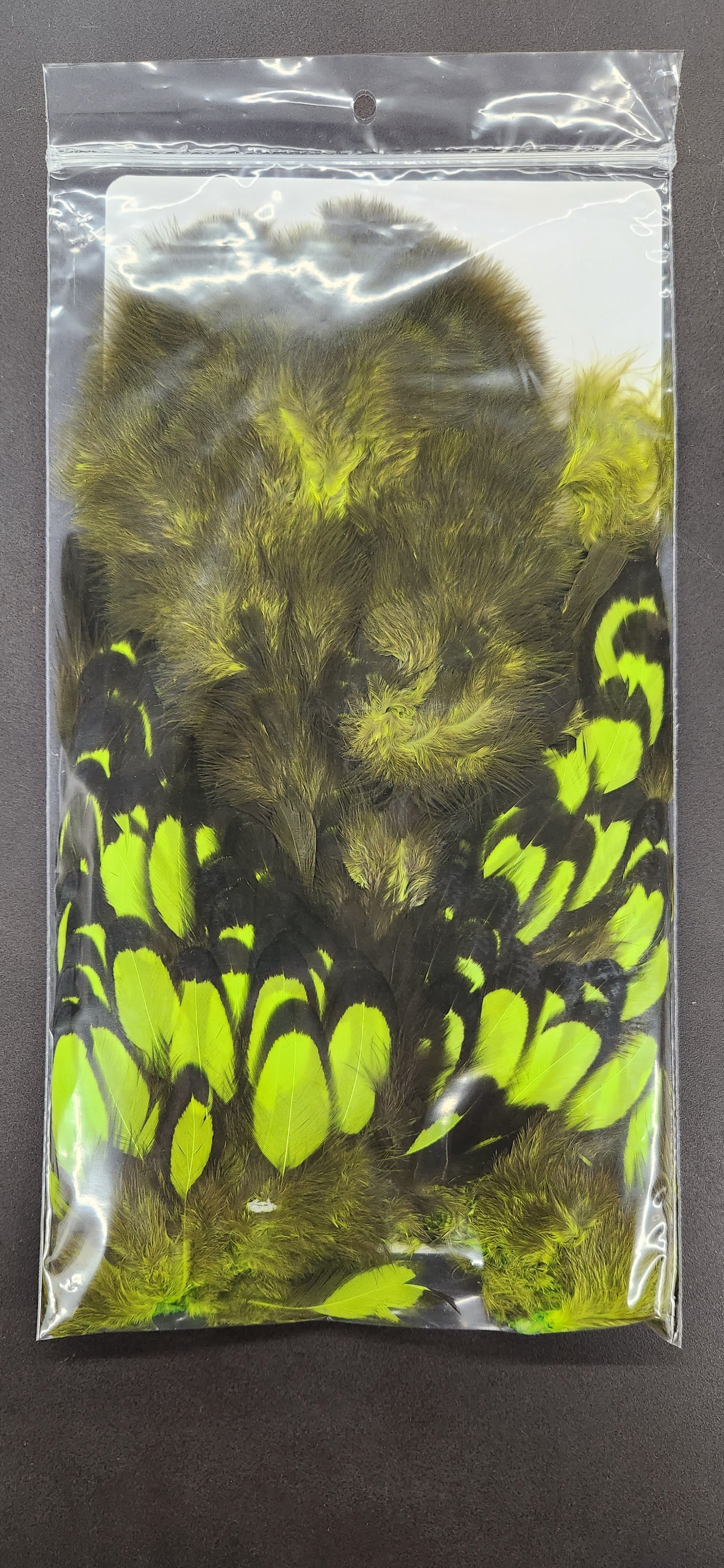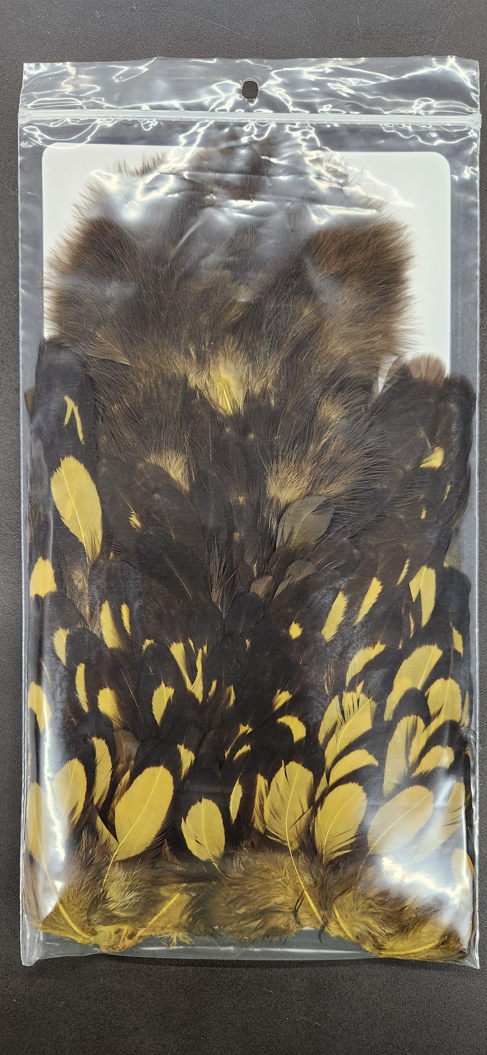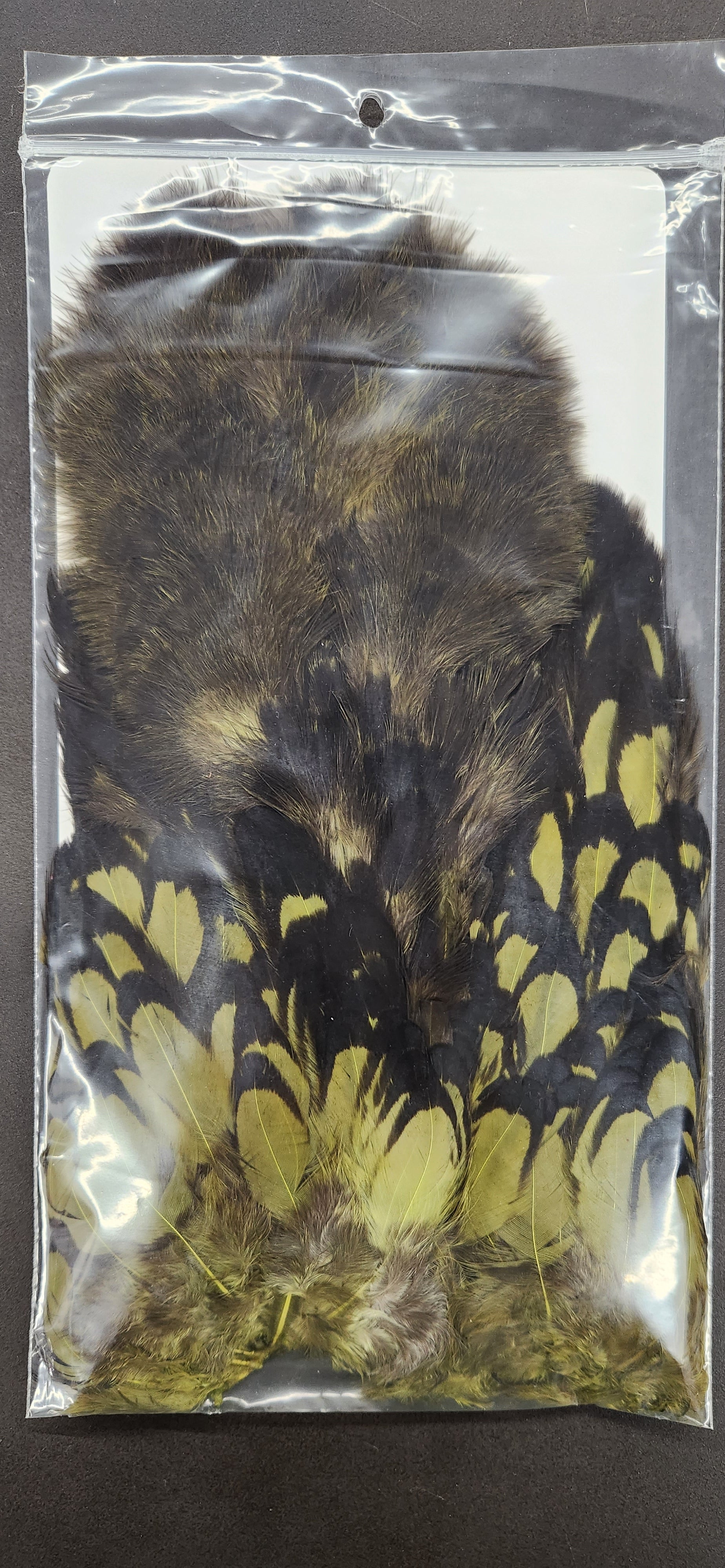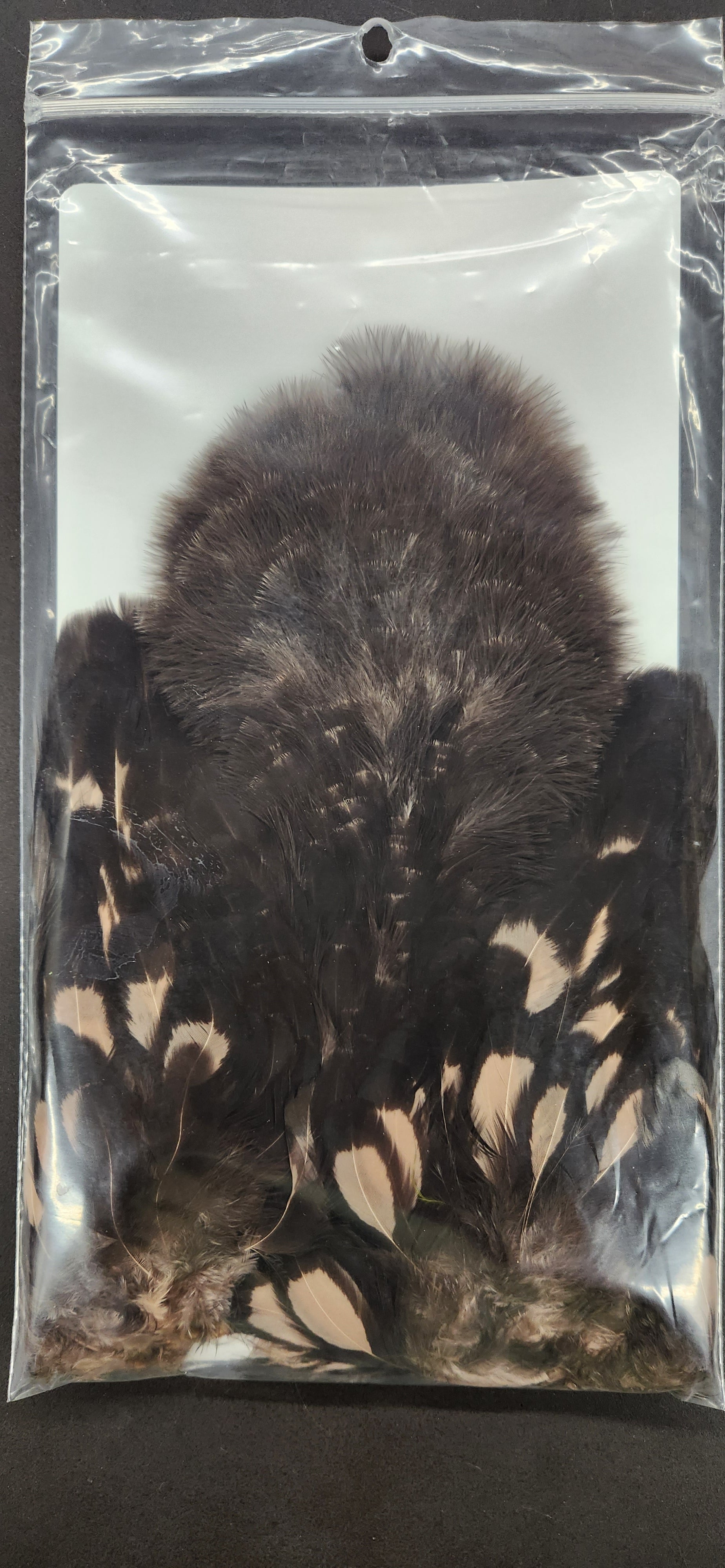 Two very unique feathers in 1 pelt. The first feather, the soft hackle, is a wide, webby, soft feather great for large collars on salmon, steelhead, bass, and saltwater flies. The second feather, the chickabou is a smaller marabou. Much finer than turkey marabou, the chickabou is excellent for small streamers, leech patterns, dragonfly, and damselfly nymphs.